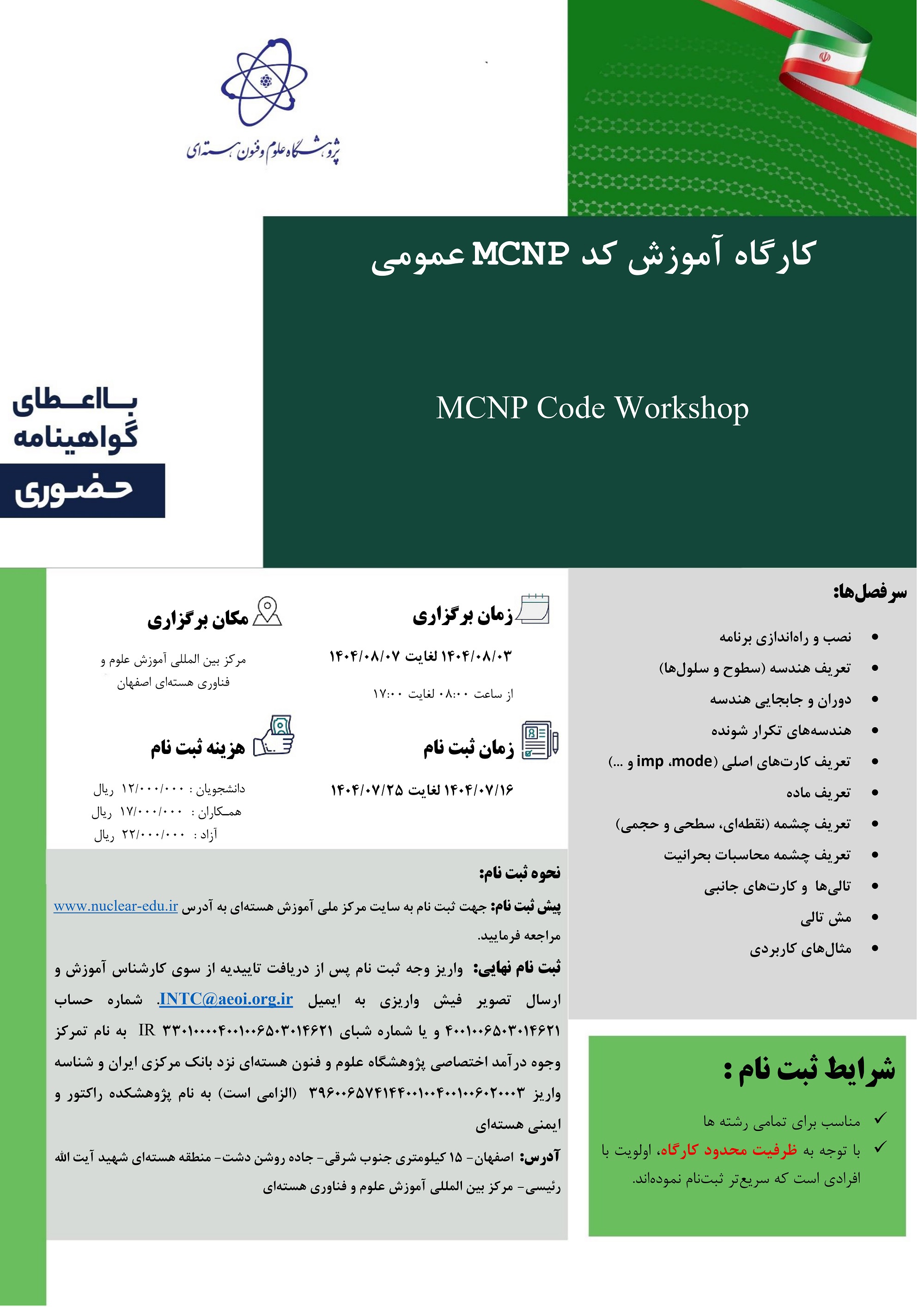 برگزاری کارگاه آموزش کد MCNP عمومی بصورت حضوری از 1404/08/03 لغایت 1404/08/07 در مرکز بین المللی آموزش علوم و فناوری هستهای اصفهان