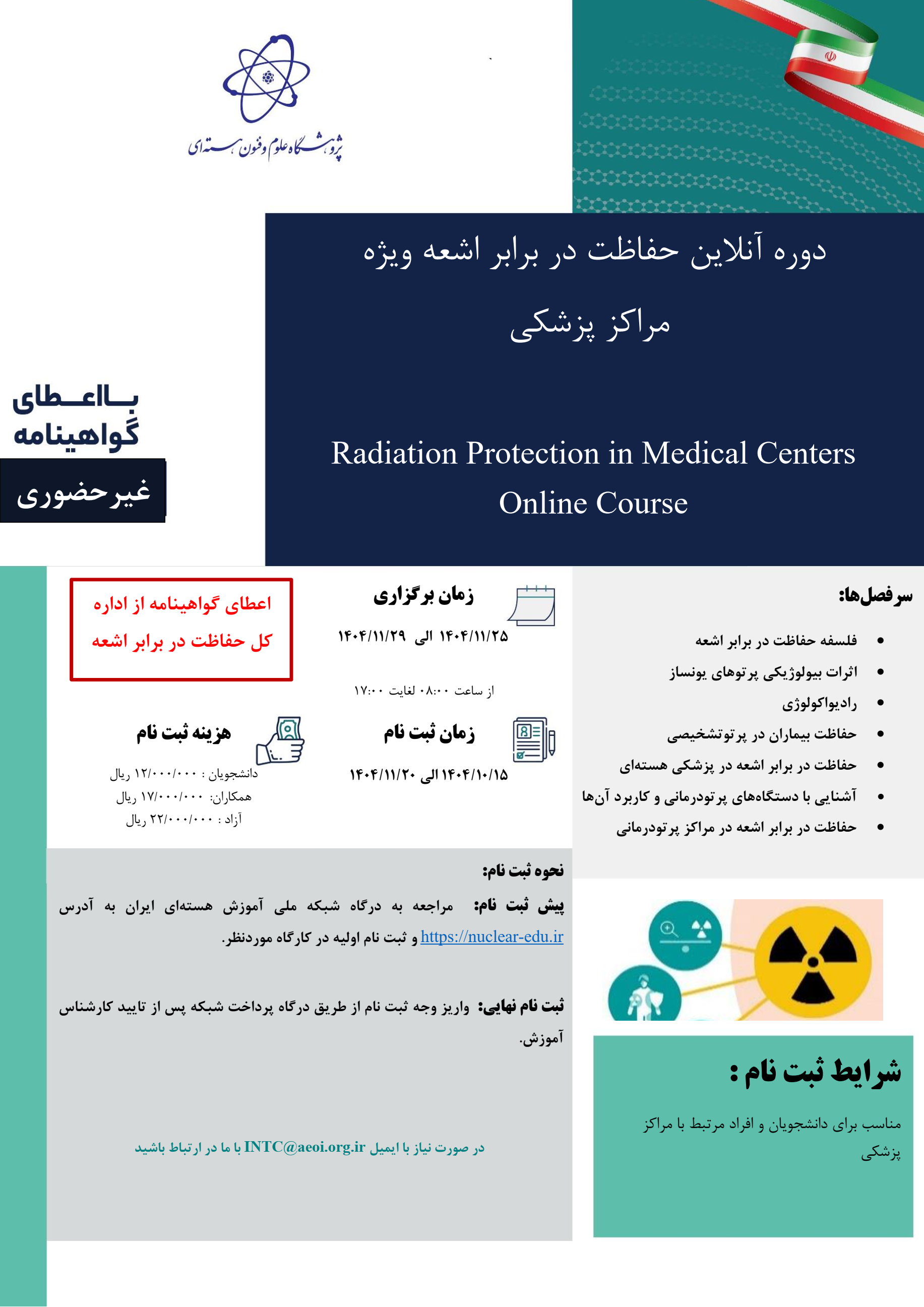 مرکز بین المللی آموزش علوم و فناوری هستهای برگزار میکند: دوره آنلاین حفاظت در برابر اشعه ویژه مراکز پزشکی از 1404/11/25 لغایت 1404/11/29