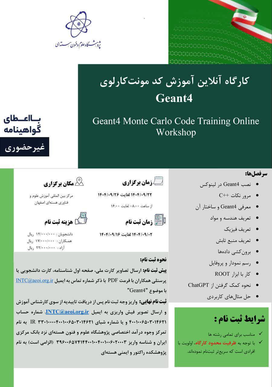 مرکز بین المللی آموزش علوم و فناوری هستهای برگزار میکند: کارگاه آنلاین آموزش کد مونت کارلوی Geant4 از 1404/09/22لغایت 1404/09/26 برگزار می شود.