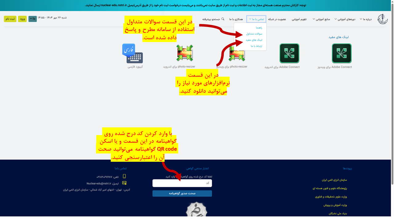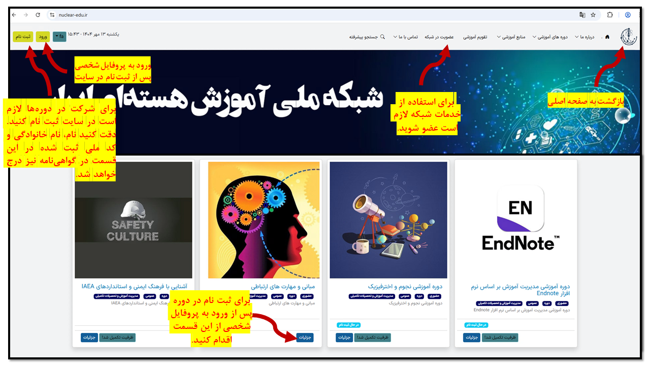 توجه: کارکنان محترم صنعت هسته‌ای مجاز به ثبت اطلاعات و ثبت نام در سایت نمی‌باشند و می‌بایست درخواست ثبت نام خود را به همراه نام، نام خانوادگی، کد ملی و محل استقرار از طریق آدرس‌ایمیل nuclear-edu@nstri.ir ارسال نمایند.